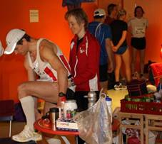 Orthopédie : J’essaie de nouvelles semelles orthopédiques, j’ai la 826 de New-Balance, la même paire qu’à Séoul. Stand Ravitaillement : Comme j’ai de la peine à savoir où est mon stand de ravitaillement, je demande à Julia de pendre le drapeau suisse pour avoir un repère. Ainsi, je peux me préparer d’être à la corde pour me ravitailler.