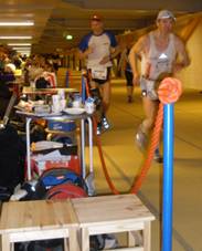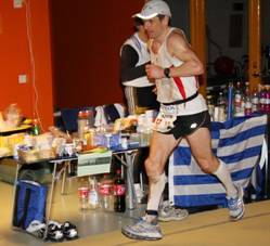 Comme j’ai tout vomi et que je ne peux plus voir de gel en peinture et les avaler, je commence à avoir faim. Julia me prépare des tucs broyés et mélangés dans du liquide chaud, pour en faire une soupe consistante. Je goûte, c’est bon, je bois tout… et ressort tout illico. Mon estomac ne supporte rien. J’ai la tête plongée dans une poubelle. Ils en ont mis tous les 10 m dans la zone de ravitaillement et des cornets plastiques tout le long du parcours. Peurs qu’ils ont que l’on vomisse sur la piste, avec raison…. Je repars le ventre encore plus vide et suis bien obligé de me contenter de coca, de thé sucré et d’iso. Le manque de consistant et de calories se fait sentir et mon tempo s’amenuise. Il ne m’est plus possible de tenir mon rythme dans ces conditions. Vu que j’ai le ventre vide, je ne vais plus aux wc mais je perds davantage de temps avec mon allure de 8 km/h environ, plutôt que de m’arrêter de temps à autre aux wc et de maintenir un rythme de 10 km/h.