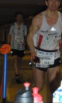 Comme j’ai tout vomi et que je ne peux plus voir de gel en peinture et les avaler, je commence à avoir faim. Julia me prépare des tucs broyés et mélangés dans du liquide chaud, pour en faire une soupe consistante. Je goûte, c’est bon, je bois tout… et ressort tout illico. Mon estomac ne supporte rien. J’ai la tête plongée dans une poubelle. Ils en ont mis tous les 10 m dans la zone de ravitaillement et des cornets plastiques tout le long du parcours. Peurs qu’ils ont que l’on vomisse sur la piste, avec raison…. Je repars le ventre encore plus vide et suis bien obligé de me contenter de coca, de thé sucré et d’iso. Le manque de consistant et de calories se fait sentir et mon tempo s’amenuise. Il ne m’est plus possible de tenir mon rythme dans ces conditions. Vu que j’ai le ventre vide, je ne vais plus aux wc mais je perds davantage de temps avec mon allure de 8 km/h environ, plutôt que de m’arrêter de temps à autre aux wc et de maintenir un rythme de 10 km/h.